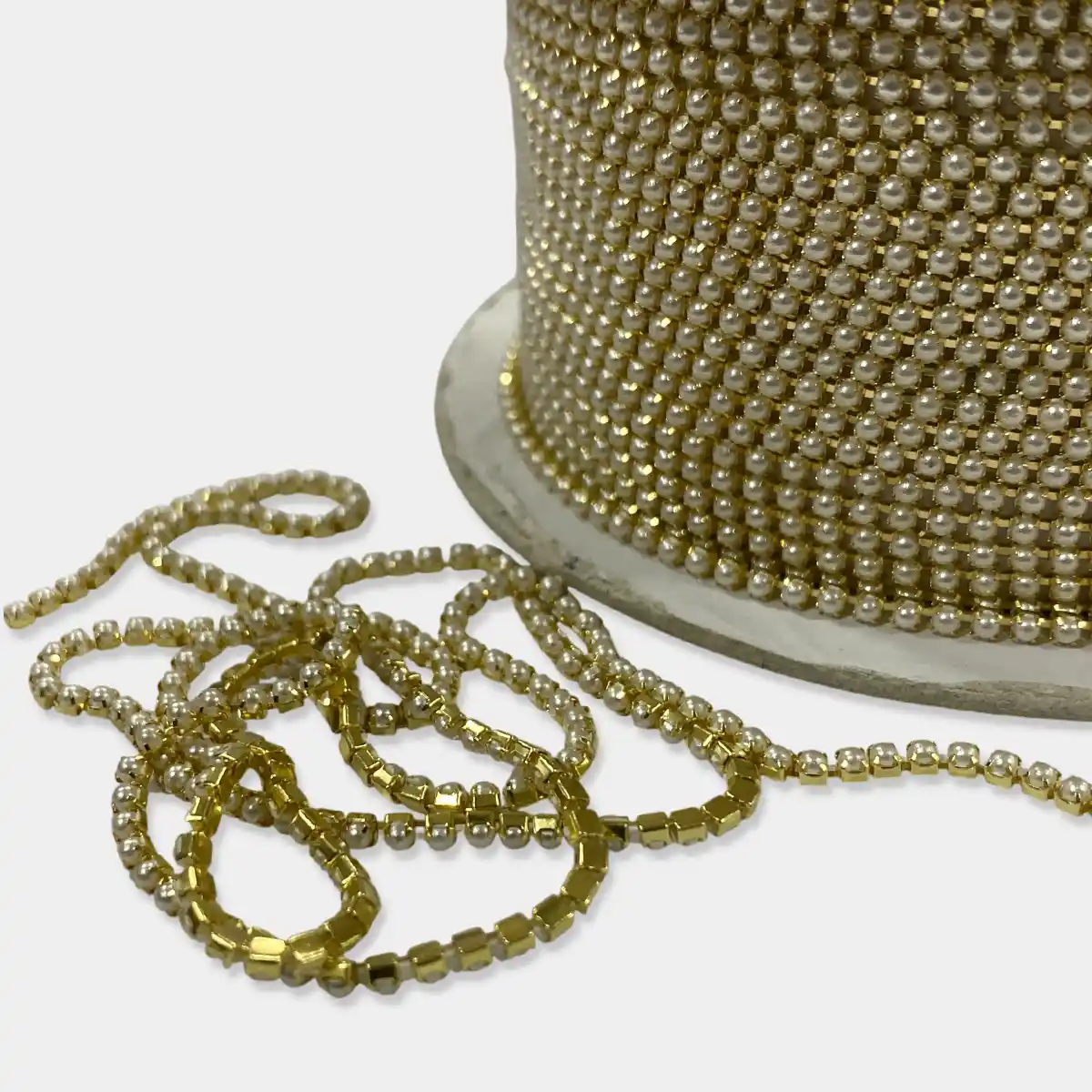 Color: White pearls with a gold base, Size: 14PP (approx. 2~2.5mm diameter), Length: 1 Meter.